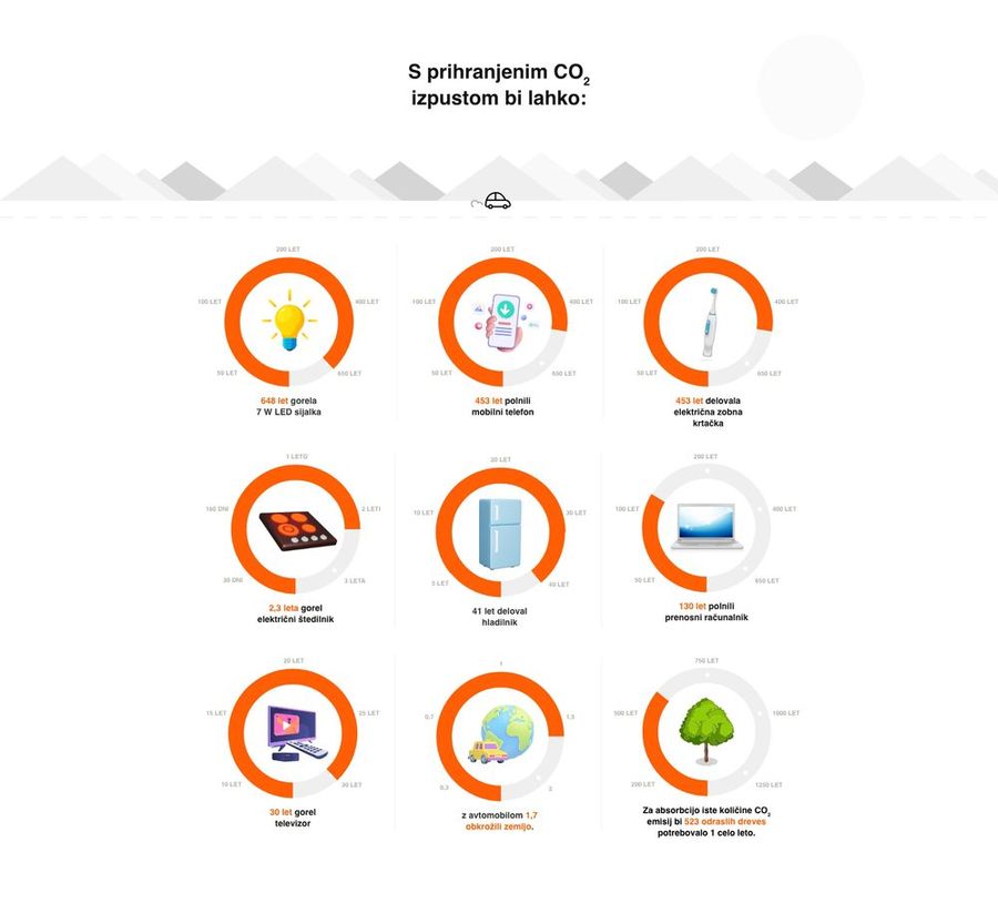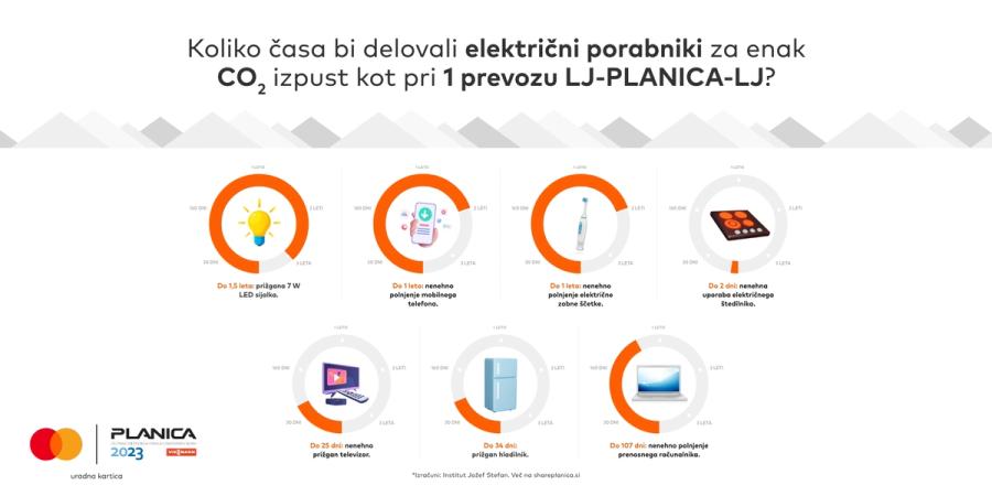 Koliko CO2 izpustov pa lahko z 1 deljenim prevozom v Planico sploh prihranimo? Ogromno! Da javnost seznanimo, kolikšen CO2 odtis nosi transport, se povežemo s Centrom za energetsko učinkovitost Instituta Jožef Stefan. Številke o CO2 odtisu prevoza v Planico iz različnih krajev po Sloveniji primerjamo z delovanjem različnih elektronskih naprav. Tako javnost seznanimo, da je en sam prevoz LJ-PLANICA-LJ odgovoren za enako količino CO2 izpustov, kot jo generira 1,5 leta prižgana 7 W LED žarnica (ekvivalent 60 W klasični sijalki), 1 leto stalno polnjenje mobilnega telefona, 74 dni stalno prižgan pomivalni stroj, 15 dni ogrevanja 120 kvadratnih metrov velike hiše z električno črpalko ali 34 dni prižgan hladilnik.