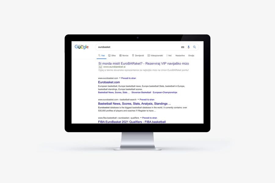 Na Googlu smo zakupili ključno besedo Eurobasket, ki je bila septembra 2017 najbolj iskan termin v Sloveniji. S skorajda 0 konkurence smo se praktično vsakemu navijaču pojavili nad vsemi organskimi zadetki in ga povprašali, ali je morda iskal Eurobarsket oz. prosto mizo v lokalu.
