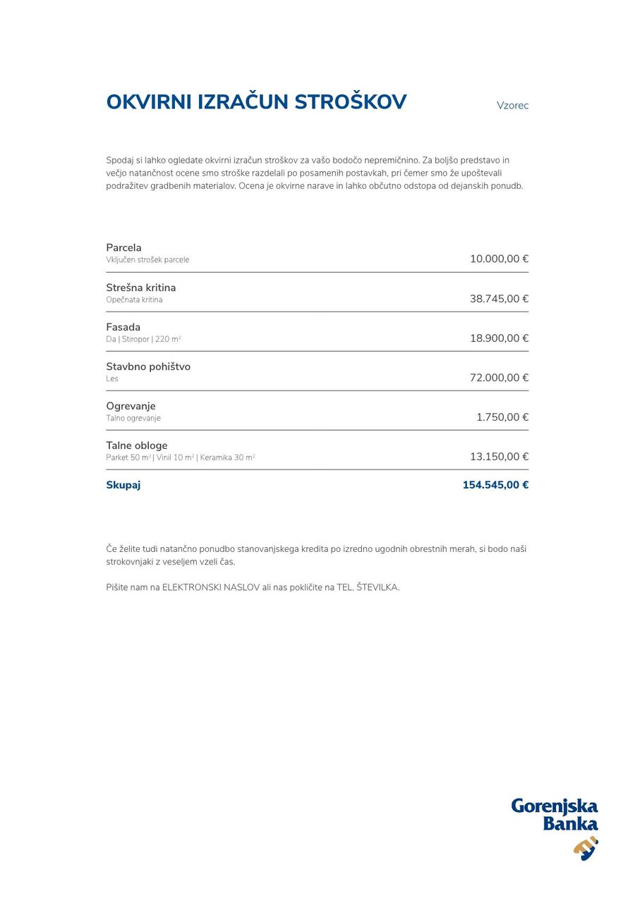 Zato je Gorenjska banka tokrat potrošnikom ponudila prvi kalkulator okvirnih stroškov gradnje in prenove v Sloveniji. Kalkulator smo razvili v sodelovanju z uveljavljenim gradbenim podjetjem in dosledno upošteva vse tiste bolj vidne in tudi tiste bolj skrite stroške, ki nastanejo pri gradnji ali prenovi nepremičnine.