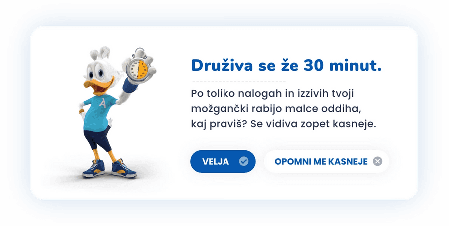 4. Za dodatno varnost smo poskrbeli s časovnimi opomniki, ki uporabnike spodbujajo k drugim aktivnostim brez digitalnih naprav (po 30 minutah uporabe portala), in s kotičkom za starše, kjer lahko spremljajo aktivnost in napredek otroka.