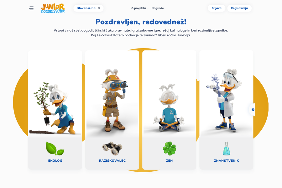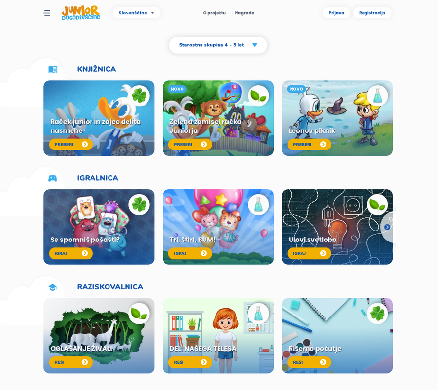 Na spletni platformi so otrokom in staršem na voljo 3 tipi unikatnih oznamčenih vsebin iz popularnih področij športa, znanosti, okoljevarstva in socialno-čustvenega razvoja. Vse vsebine so razdeljene po 3 starostnih skupinah (4-5, 6-7 in 8-9 let), izkušnjo uporabnika pa smo zaokrožili z lojalnostnim programom in kotičkom za starše, kjer lahko spremljajo aktivnost in napredek otrok.